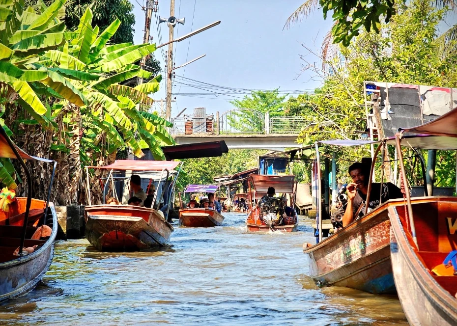 長方形彩色木筏載滿五顏六色的水果,由戴著斗笠的婦女搖槳緩緩前行,錯落在綠色的運河上,展現出一幅美麗的畫面。這裡是東方威尼斯的起源,也是歐美中外人士旅泰的指標景點,泰國旅遊局年年推薦此行程,是最接近泰國人水上傳統生活型態的回顧之地。沿岸一路吃喝買玩,隨處可見小吃和水果攤位,物美價廉。
